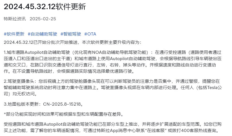 2月25日,据特斯拉消息,该公司发布软件更新。其中包括:城市道路Autopilot自动辅助驾驶(优化现有NOA自动辅助导航驾驶功能)等功能。