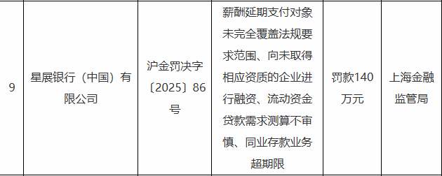 2月24日,上海金融监管局披露的行政处罚信息显示,星展银行(中国)有限公司因薪酬延期支付对象未完全覆盖法规要求范围、向未取得相应资质的企业进行融资、流动资金贷款需求测算不审慎、同业存款业务超期限等,被罚140万元。