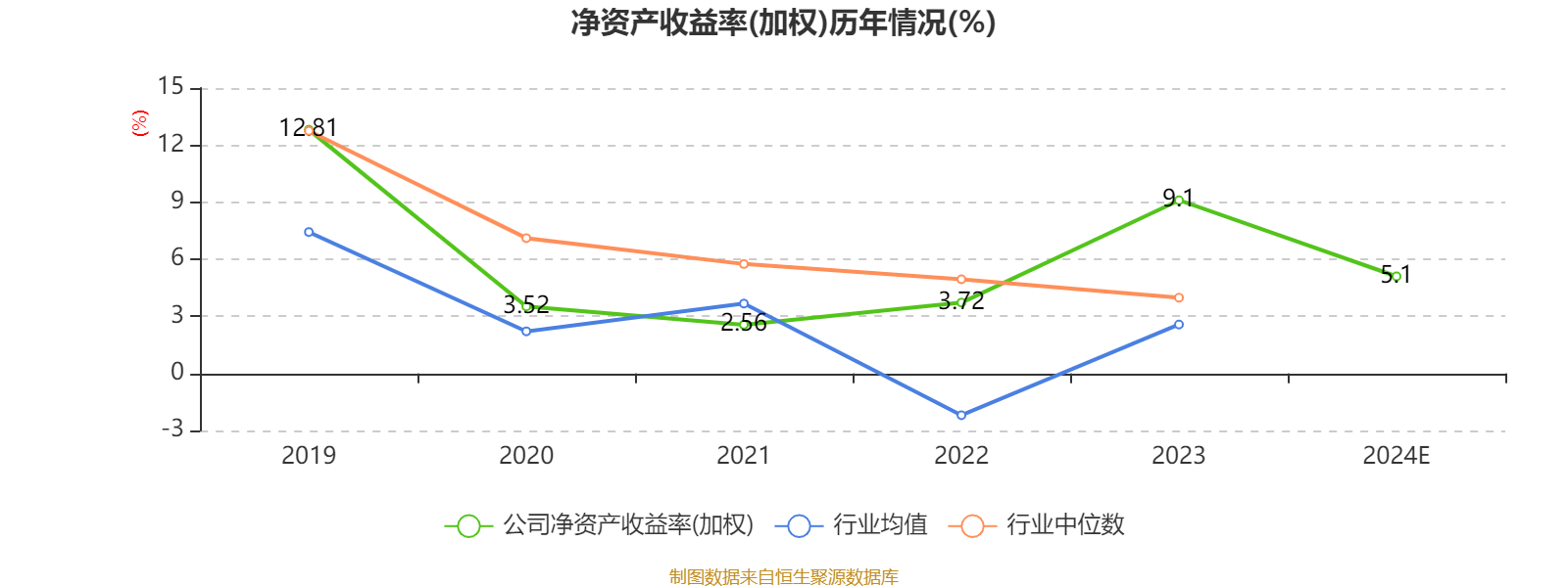 数据显示,2024年公司加权平均净资产收益率为5.1%,较上年同期下降4个百分点。