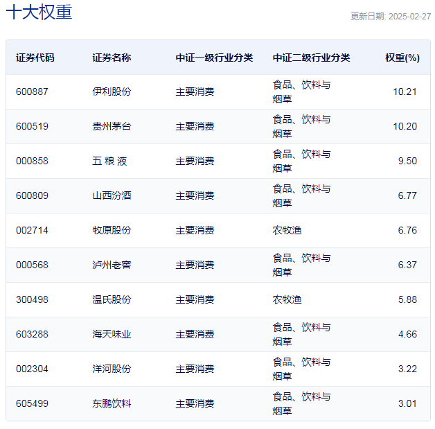 中证主要消费指数主要权重股