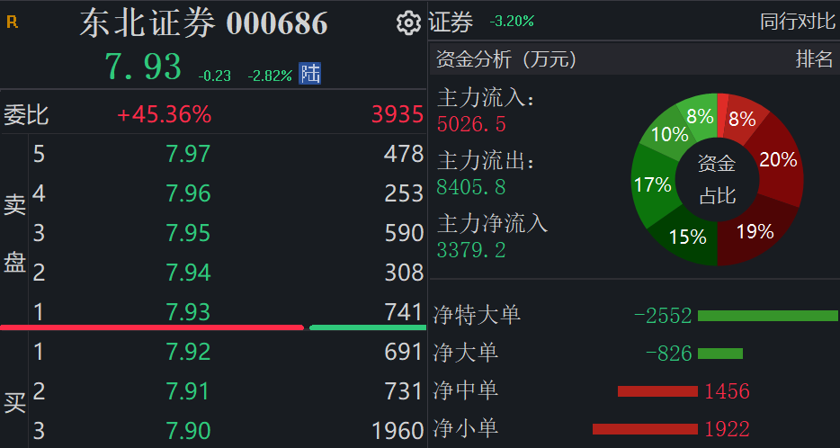 截至今日收盘,东北证券下跌2.82%,报每股7.93元,最新市值为185.6亿元。