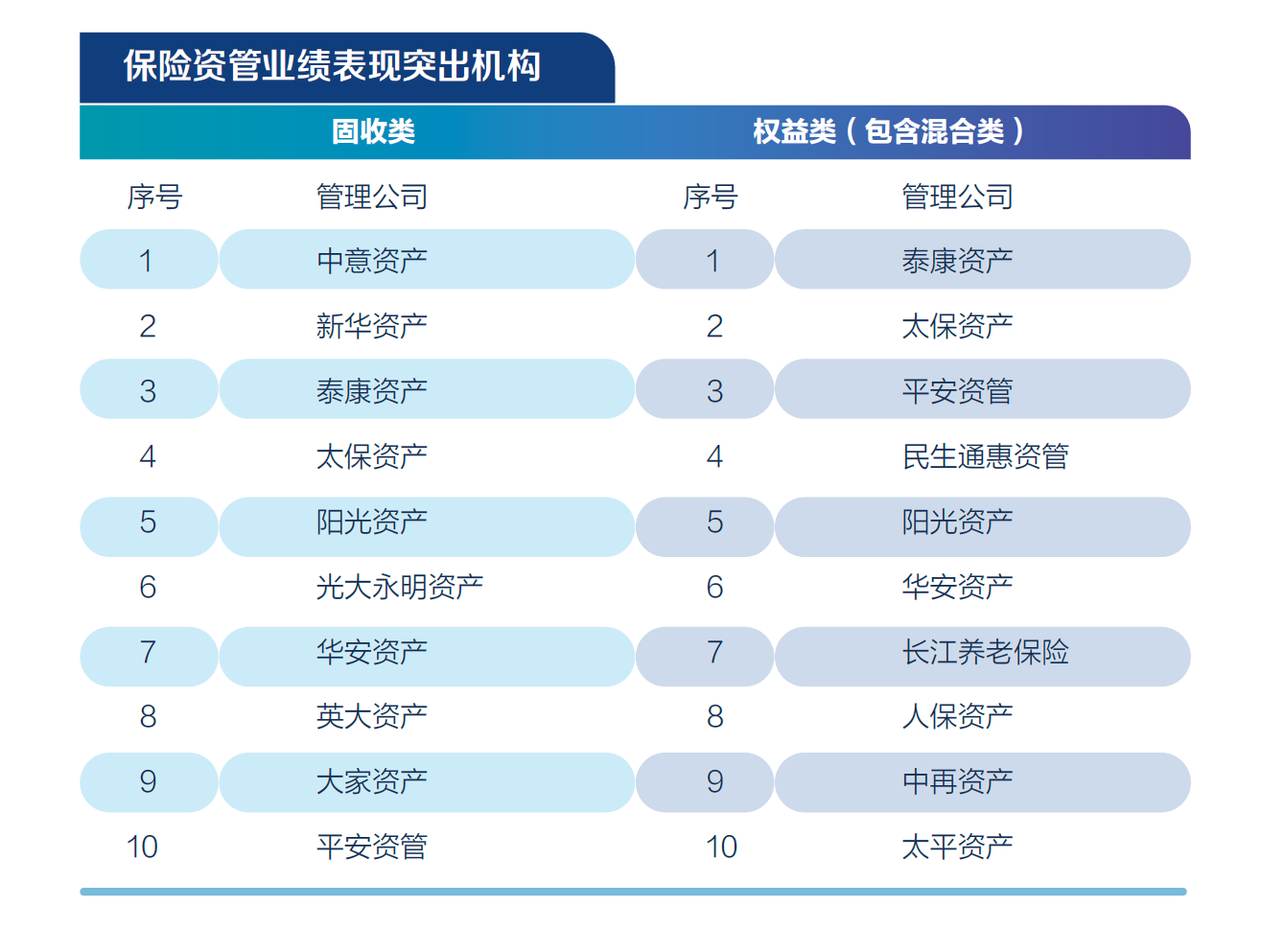 对于固收类产品,榜单前十的机构依次为中意资产、新华资产管理股份有限公司、泰康资产、太保资产、阳光资产、光大永明资产、华安资产、英大资产、大家资产和平安资管;而在权益(含混合类)产品中,泰康资产、太保资产、平安资管、民生通惠资管、阳光资产、华安资产、长江养老保险、中国人保资产管理有限公司(以下简称“人保资产”)、中再资产以及太平资产等机构,则凭借出色的产品布局和风险管理策略,获得了市场的广泛认可。