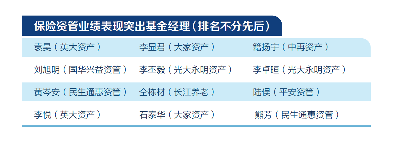与产品业绩相呼应的是基金经理群体的专业积淀,《报告》依据基金经理在保险资管领域综合表现,评选出的12位业绩表现突出的基金经理。