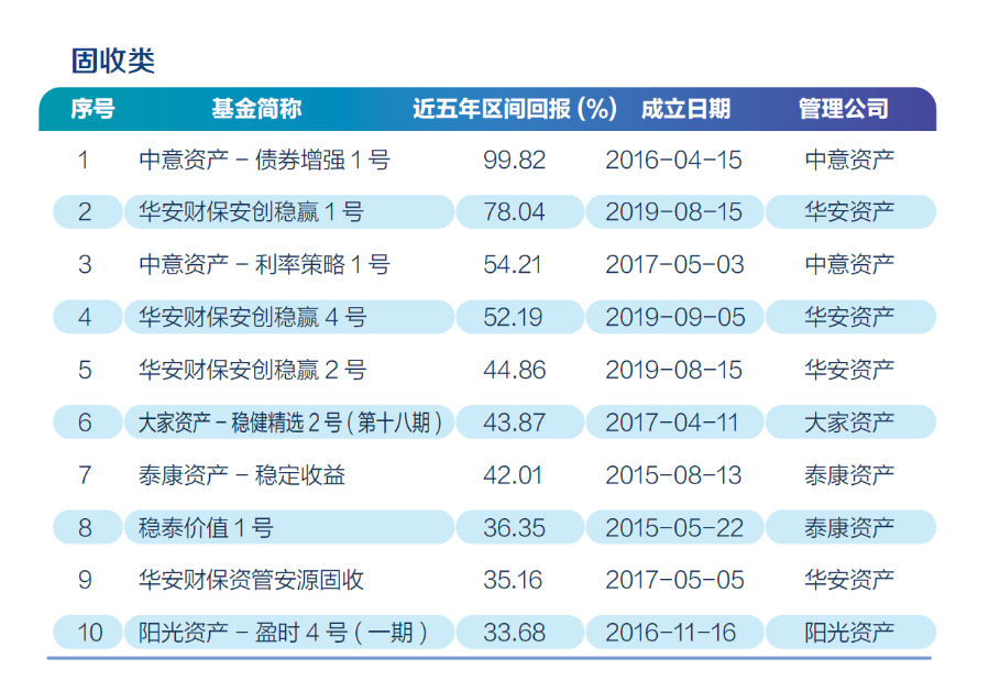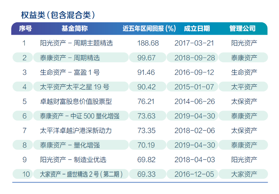 此外,《报告》显示,上榜的权益类(包含混合类)产品近五年区间回报普遍高于固收类产品。上榜的固收类产品近五年区间回报最高为99.82%,最低为33.68%。仅“中意资产-债券增强1号”、“华安财保安创稳赢1号”近五年区间回报超过60%。而权益类(包含混合类)近五年区间回报在69.33%-188.68%之间,均高于60%。