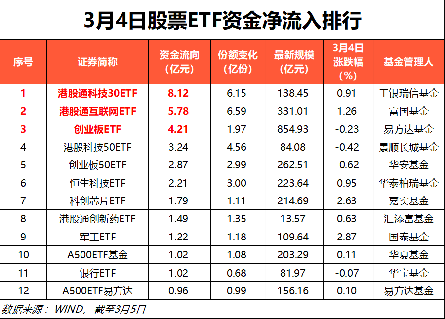【导读】3月4日股票ETF资金净流出超23亿元,多类“含港”指数净流入