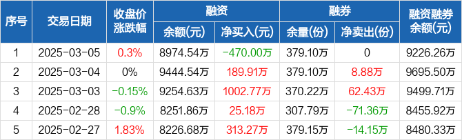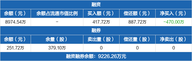 融资方面,当日融资买入417.72万元,融资偿还887.72万元,融资净偿还470万元。融券方面,融券卖出0份,融券偿还0份,融券余量379.1万份,融券余额251.72万元。融资融券余额合计9226.26万元。