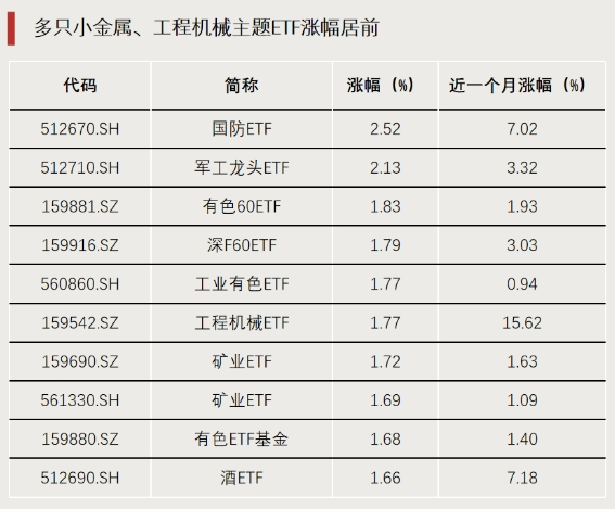 市场成交额较前一日略有缩量。小金属、工程机械、军工装备等行业涨幅居前,多元金融、电池、房地产等行业跌幅居前,影视院线、证券、医疗服务等同步走弱。A股ETF方面,国防ETF(512670)、军工龙头ETF(512710)涨幅超过2%,有色60ETF(159881)、工业有色ETF(560860)、矿业ETF(159690)等涨幅超过1%。