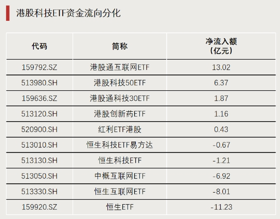 值得关注的是,今年以来,港股通互联网ETF和恒生科技ETF的资金流向分化尤其明显,截至3月6日,港股通互联网ETF、港股通科技30ETF、港股创新药ETF分别净流入74.84亿元、44.45亿元、40.96亿元,而恒生互联网ETF、中概互联网ETF、恒生ETF分别净流出102.99亿元、84.04亿元、48.71亿元。