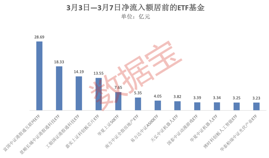 从资金流向来看,3月首周,47只ETF资金净流入额过亿元,其中4只净流入额在10亿元以上。富国中证港股通互联网ETF净流入额居首,达到28.69亿元;景顺长城中证港股通科技ETF、工银国证港股通科技ETF、嘉实上证科创板芯片ETF随后,金额依次为18.33亿元、14.19亿元、13.55亿元。