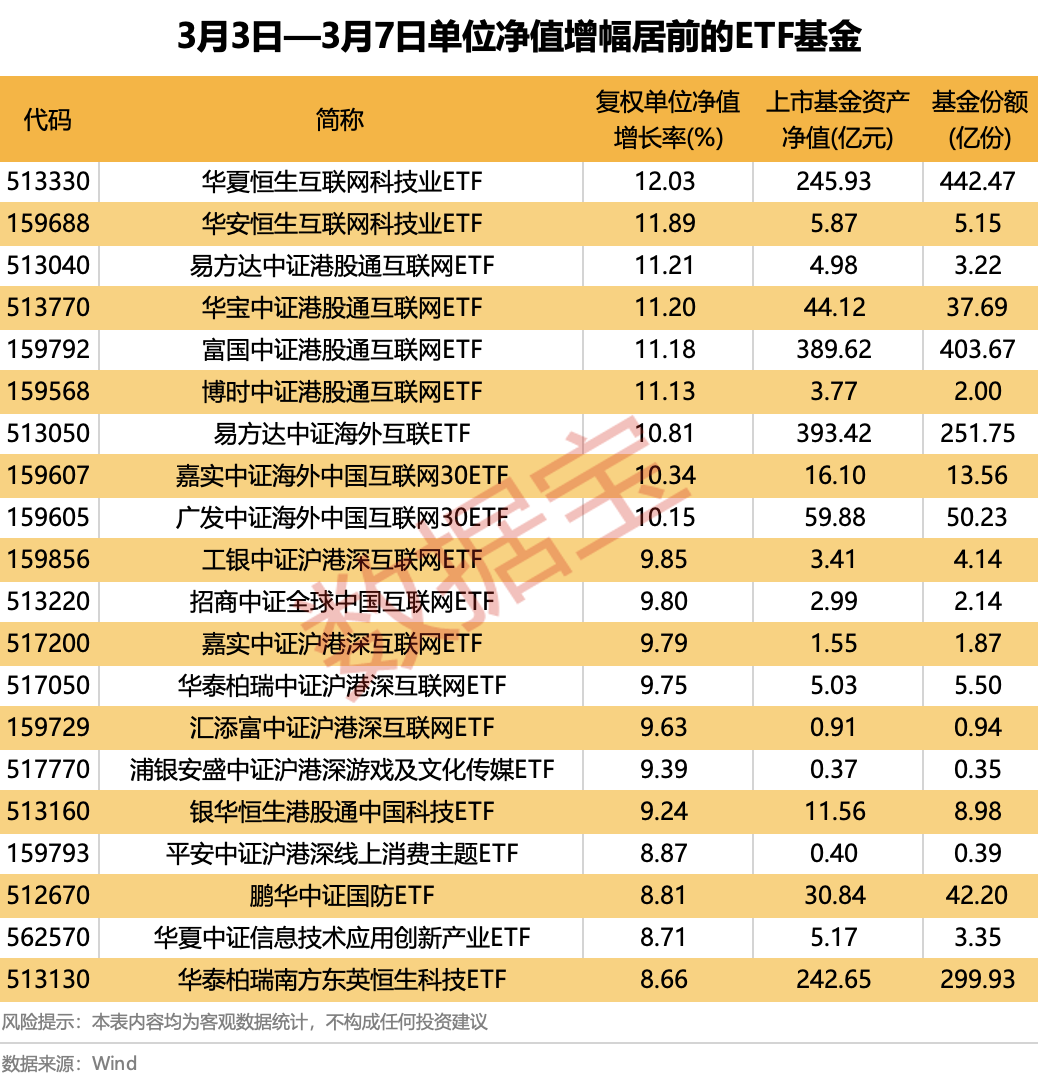 资金追逐科技类ETF,互联网主题基金大幅上涨。