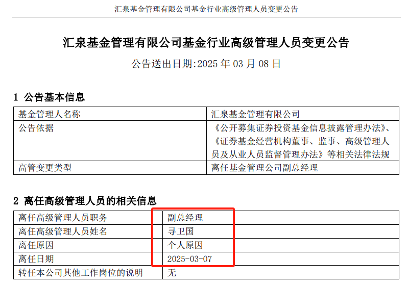 日前,汇泉基金发布公告称,因个人原因,公司副总经理寻卫国于3月7日离任,距离他今年1月上任还不到两个月时间。