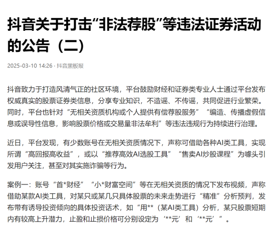 3月10日,抖音安全中心发布关于打击“非法荐股”等违法证券活动的公告。