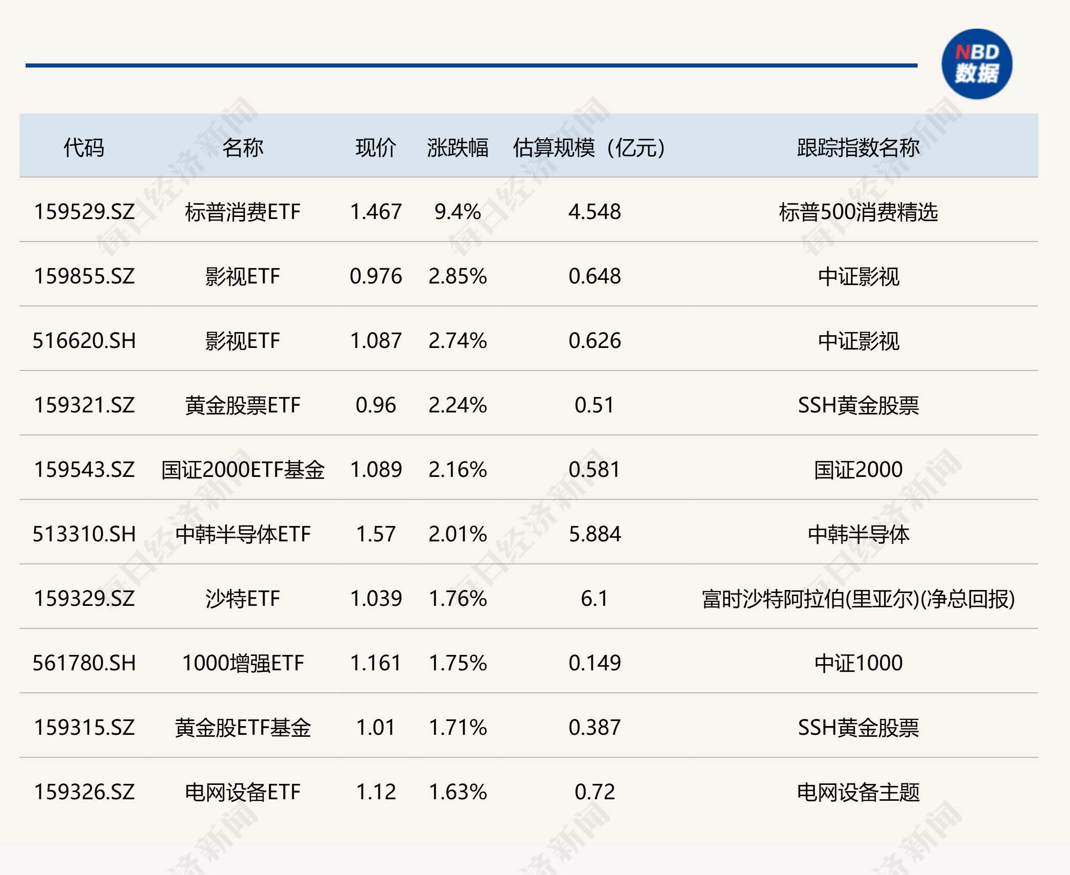 ETF涨跌幅方面,标普消费ETF涨超9%,影视ETF涨超2%。