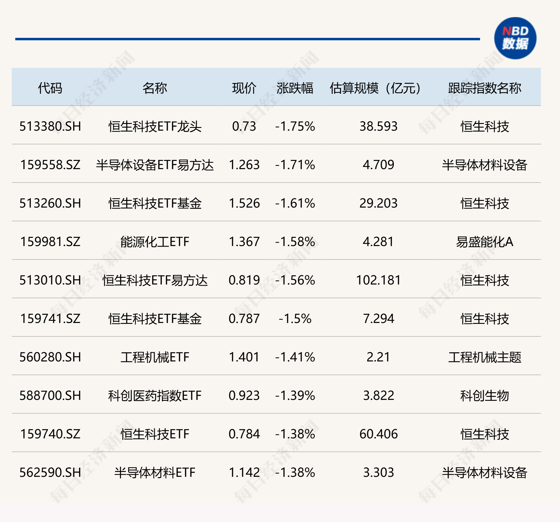 下跌方面,多只恒生科技相关ETF跌逾1%。