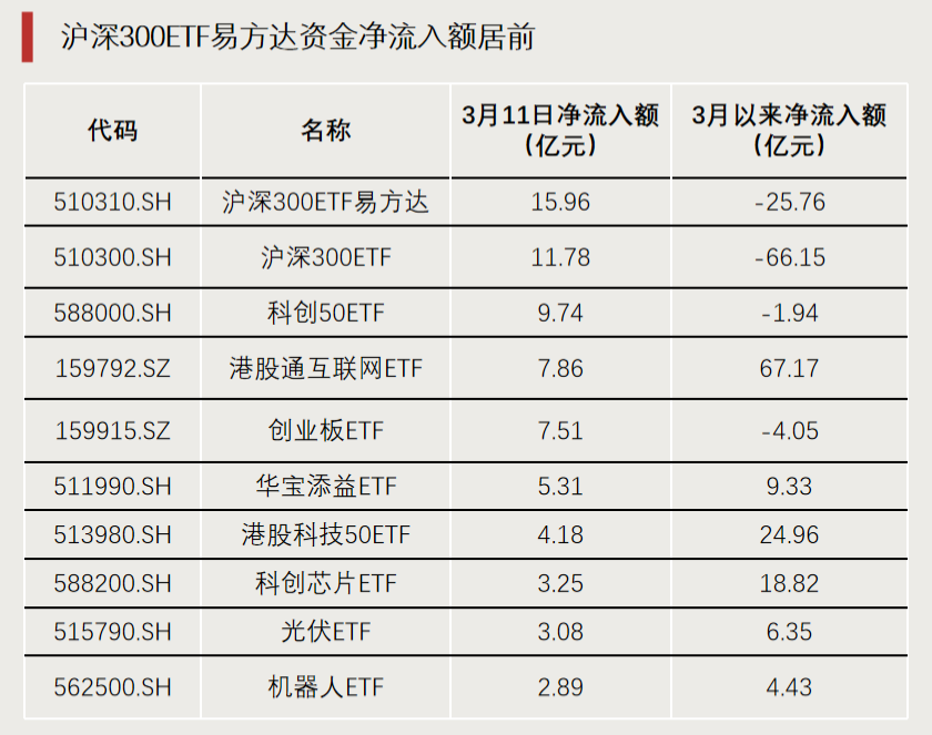 资金流向方面,数据显示,3月11日,全市场1000余只ETF资金净流入额合计约70亿元。其中,沪深300ETF易方达获15.96亿元资金净流入,位居榜首;沪深300ETF资金净流入额达11.78亿元,居第二;科创50ETF、港股通互联网ETF、创业板ETF等资金净流入额也位居前列。