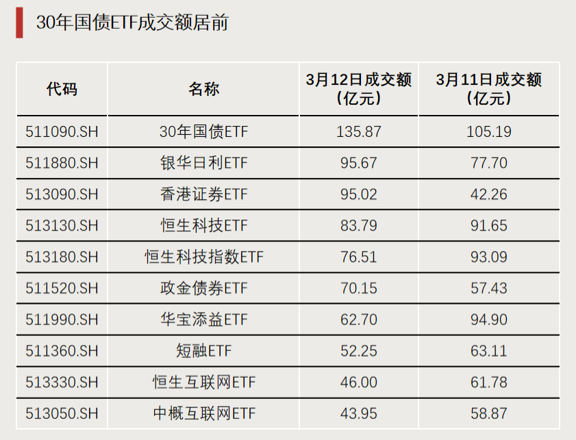 具体来看,30年国债ETF、银华日利ETF、香港证券ETF当日成交额居前,均较前一交易日显著放量。