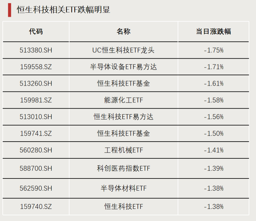 港股大型科技股普遍下跌,恒生科技指数收跌2.04%,相关ETF当日跌幅明显。