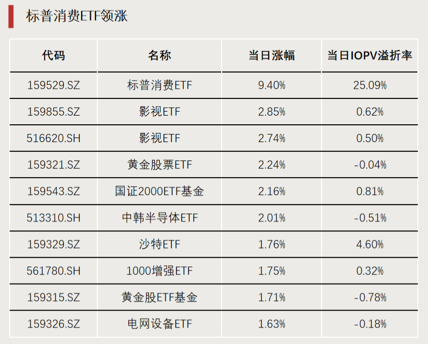 ETF方面,标普消费ETF复牌后持续走高,截至收盘上涨9.40%,领涨全市场ETF,溢价率高达25.09%。