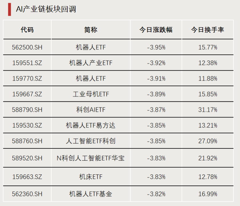 价值风格走强的同时,今日市场“跷跷板”效应显著,成长板块整体趋弱,机器人、芯片等AI相关板块跌幅居前,机器人ETF(562500)、机器人产业ETF(159551)等跌幅接近4%。