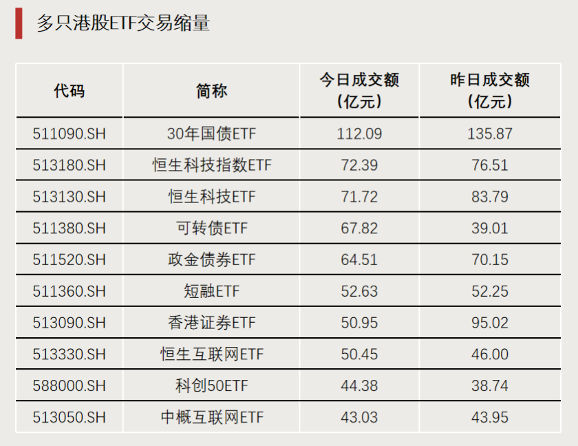 从成交额表现来看,今日多只港股ETF交易热度下降,成交额较昨日出现缩量,香港证券ETF(513090)成交额减少超44亿元,恒生科技ETF(513130)成交额也减少10亿元以上。