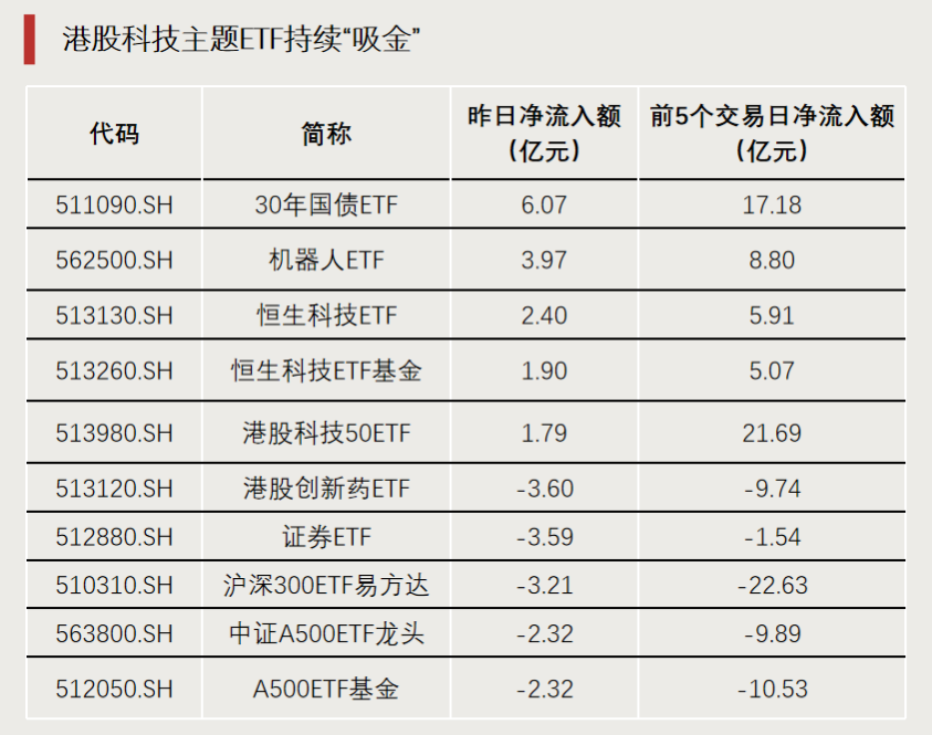 昨日,10只跟踪恒生科技指数的ETF合计净流入超9亿元,跟踪港股通科技、港股通互联网指数的ETF分别净流入3.66亿元、2.35亿元。