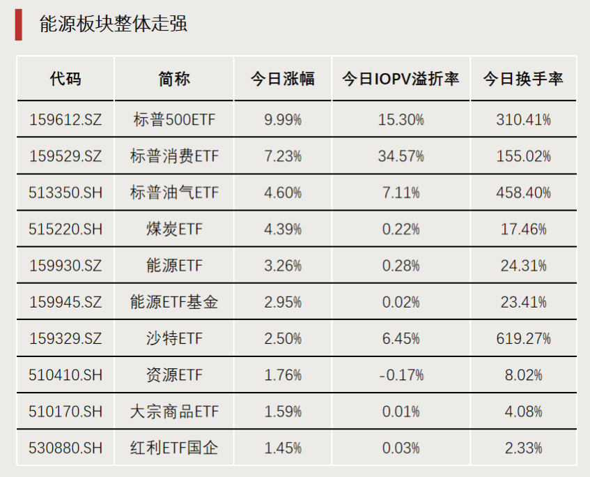 此外,今日跨境ETF交易再度活跃,换手率、溢价率明显抬升。标普500ETF(159612)尾盘涨停,溢价率超15%;沙特ETF(159329)、标普油气ETF(513350)换手率分别高达619.27%、458.40%。