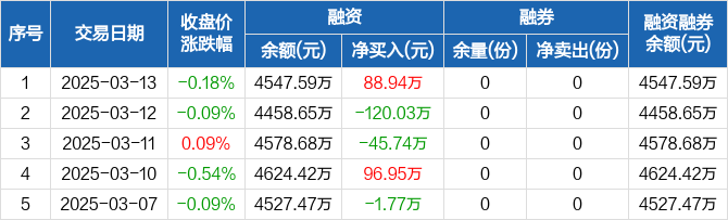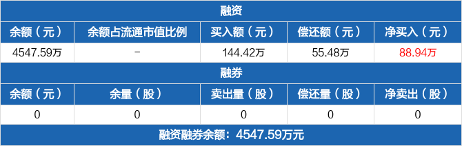 融资方面,当日融资买入144.42万元,融资偿还55.48万元,融资净买入88.94万元。融券方面,融券卖出0份,融券偿还0份,融券余量0份,融券余额0元。融资融券余额合计4547.59万元。