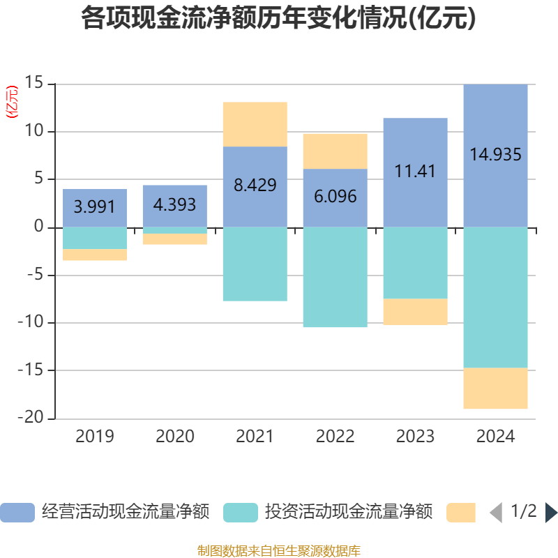 截至2024年,公司经营活动现金流净额为14.94亿元,同比增长30.89%;筹资活动现金流净额-4.27亿元,同比减少1.54亿元;投资活动现金流净额-14.72亿元,上年同期为-7.5亿元。