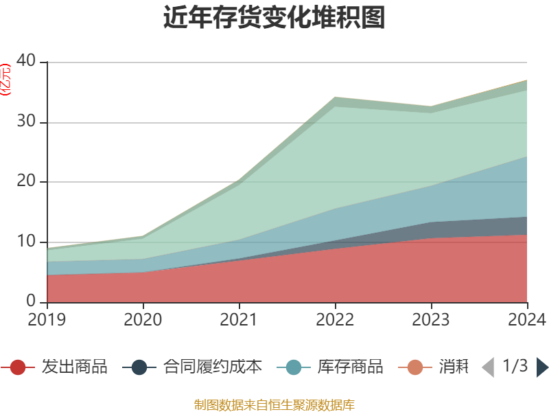 从存货变动来看,截至2024年末,公司存货账面价值为36.96亿元,占净资产的38.33%,较上年末增加4.37亿元。其中,存货跌价准备为4.06亿元,计提比例为9.89%。