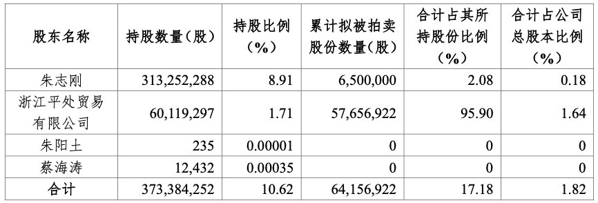 具体而言,本次将被司法拍卖的标的物为朱志刚持有的650万股股份,占其持股总数的2.08%,占公司总股本的0.18%;以及平处贸易持有的5766万股股份,占其持股总数的95.9%,占公司总股本的1.64%。此次拍卖合计涉及6416万股股份,占公司总股本的1.82%。