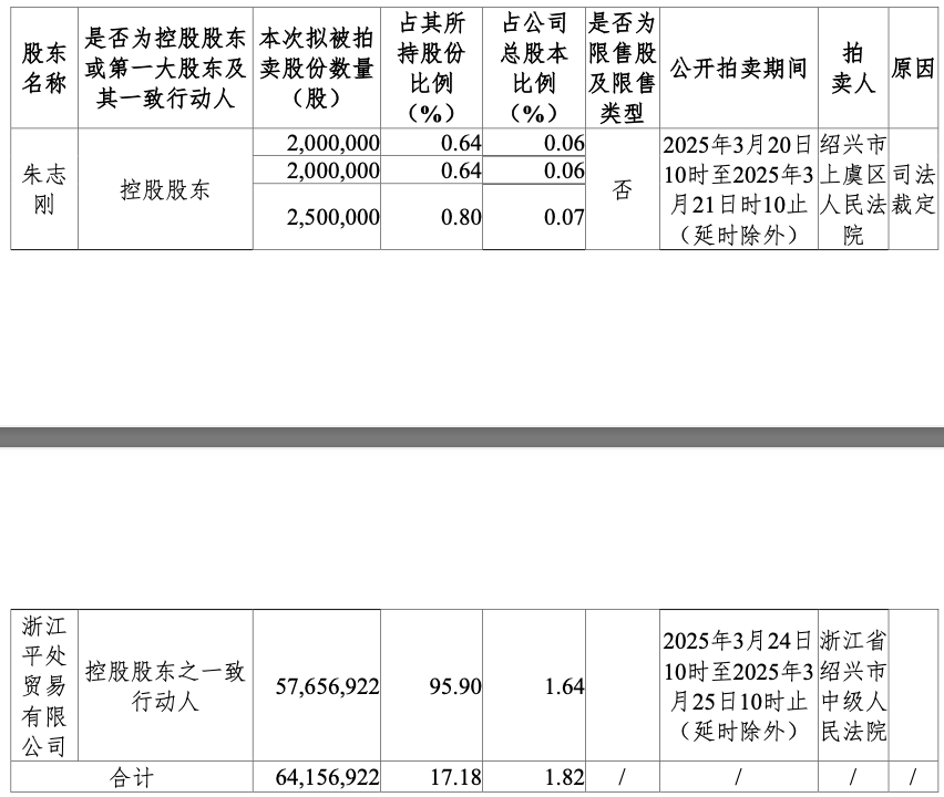 公告称,公司于近日收到股东浙江平处贸易有限公司通知,其已收到绍兴中院下发的四份执行裁定书。 绍兴中院裁定拍卖平处贸易持有的公司209039277股股份,已挂网公示其中151382355股股份的拍卖,占平处贸易持有公司股份总数的71.58%,占公司股份总数的4.31%。