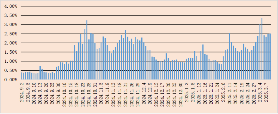 其次是北交所股票的成交金额占沪深北三市成交总额的比例。该占比也是自2024年9月24日之后显著提高,特别是今年春节以来已经能够常规化地稳定在2%以上,最高的时候曾经在3月5日达到了3.37%,当前的占比情况甚至好于2024年的10月、11月份。