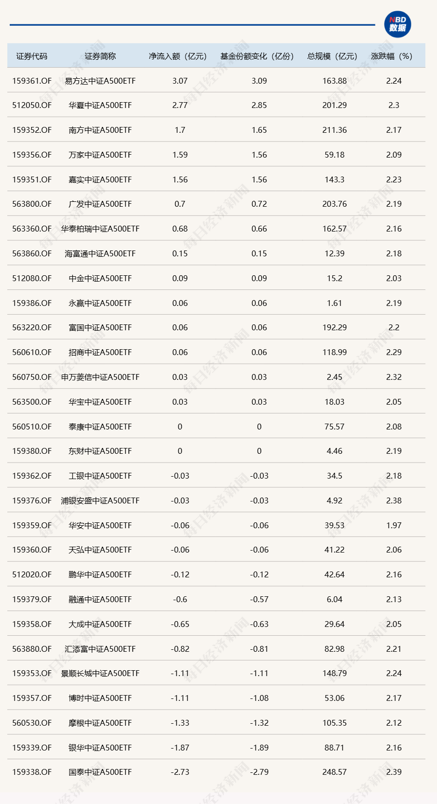 此外,当天场内29只中证A500ETF合计净流入2.04亿元。