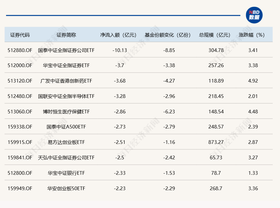 与此同时,国泰中证全指证券公司ETF净流出额10.13亿元,基金份额减少8.85亿份;华宝中证全指证券ETF净流出额3.7亿元,基金份额减少3.38亿份;广发中证香港创新药ETF净流出额3.68亿元,基金份额减少4.27亿份。