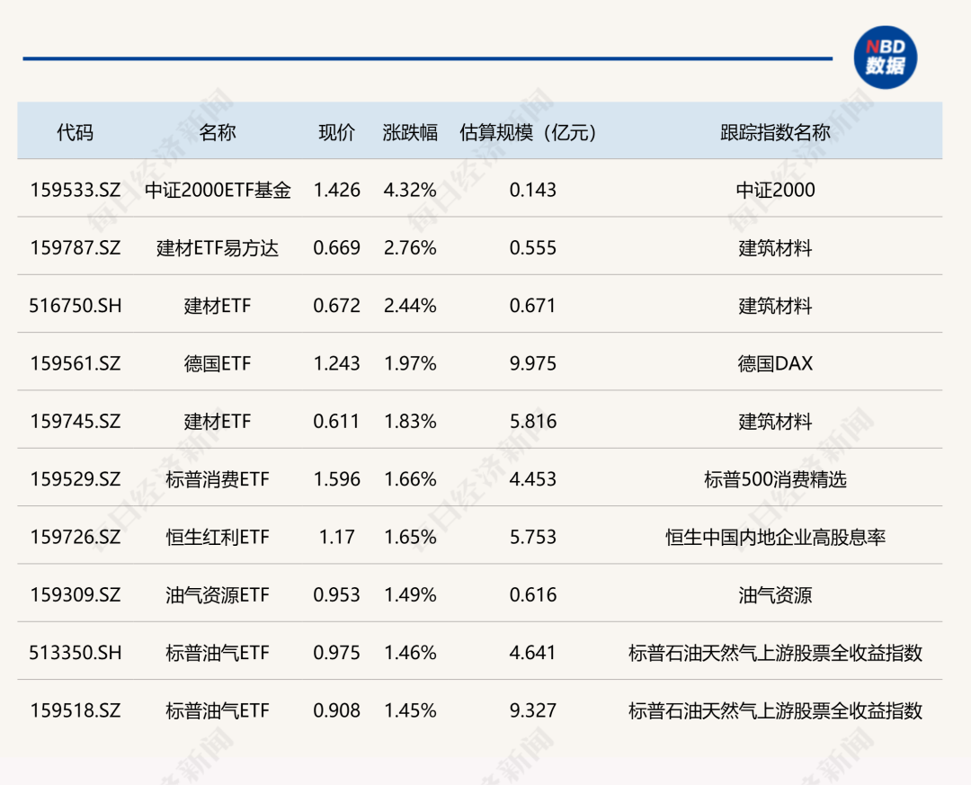 ETF涨跌幅方面,中证2000ETF基金涨超4%,建材相关ETF涨超2%。