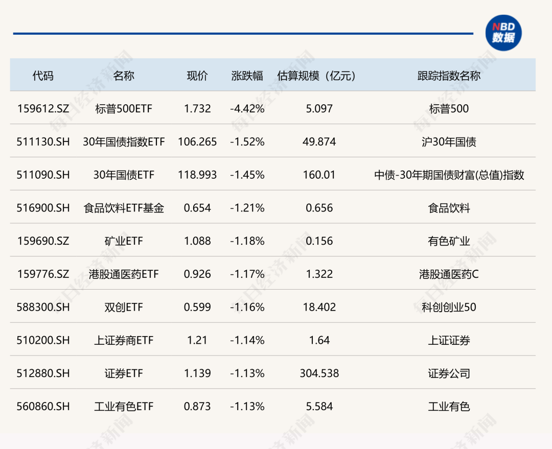 下跌方面,标普500ETF跌逾4%。