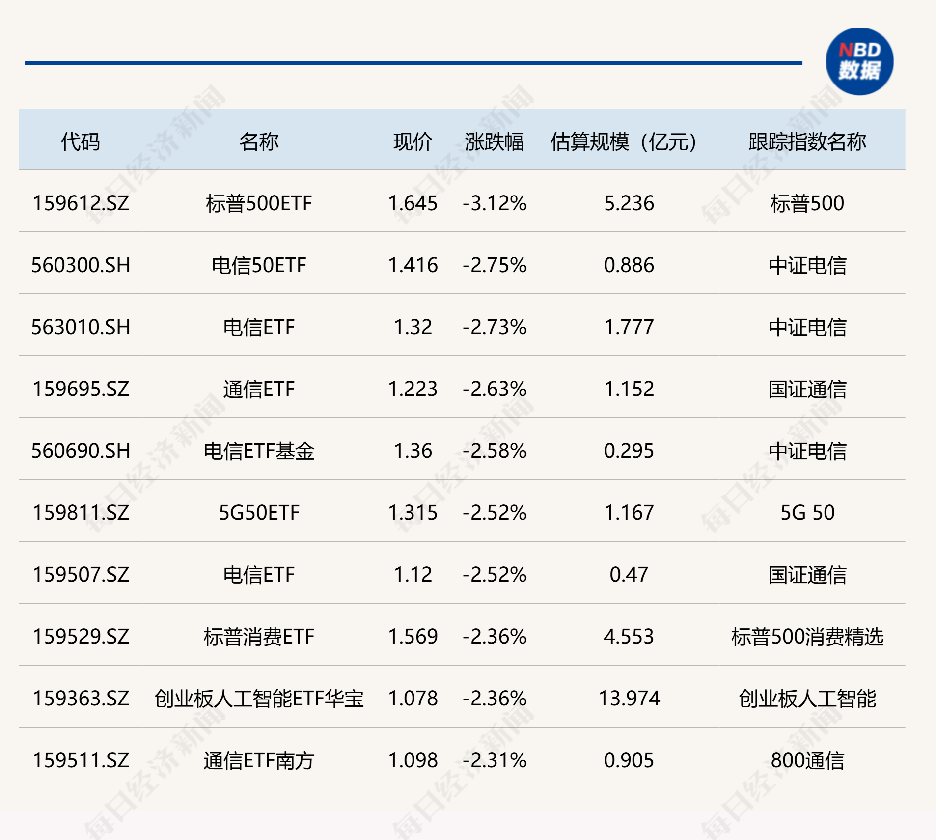 下跌方面,标普500ETF跌超3%,电信、通信等ETF跌逾2%。