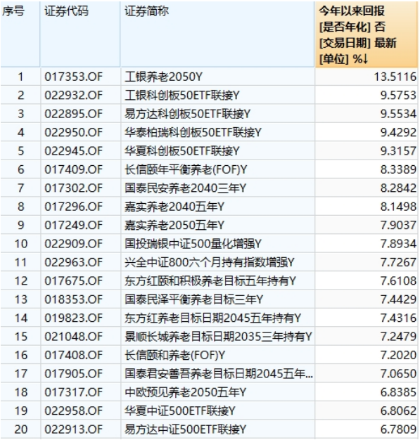 数据显示,年初至今,个人养老金中的基金产品,工银养老2050Y收益率达到13.51%,成为唯一收益率超过10%的基金;此外,34只基金收益超过5%,170只基金收益跑赢上证指数涨幅,95%的基金都实现了正收益。