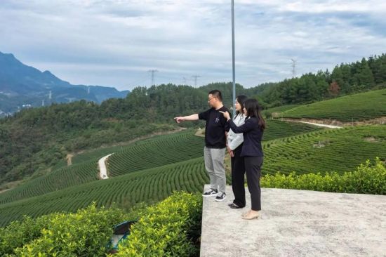 图为重庆银行工作人员陪同企业相关负责人查看茶树生长情况。重庆银行供图