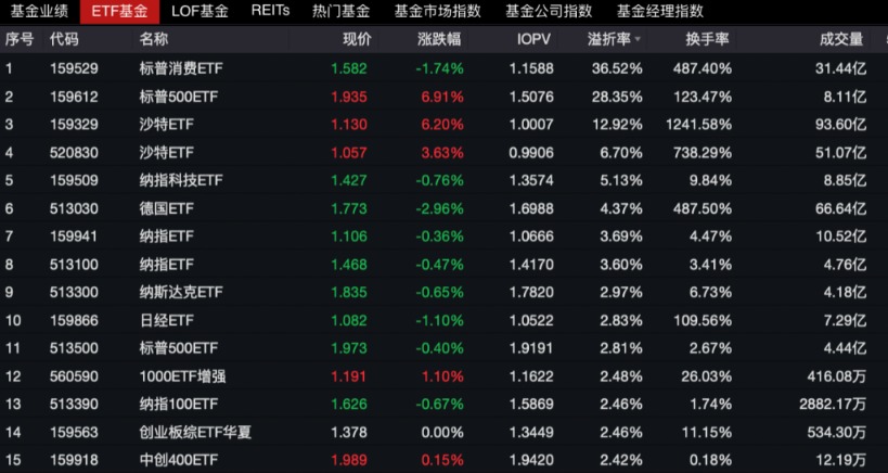 与此同时,数据显示,周五溢价率前十的ETF基金均为跨境ETF。具体来看,景顺长城标普消费精选ETF的溢价率高达36.52%,国泰标普500ETF、南方基金南方东英沙特阿拉伯ETF的溢价率则分别为28.35%、12.92%。