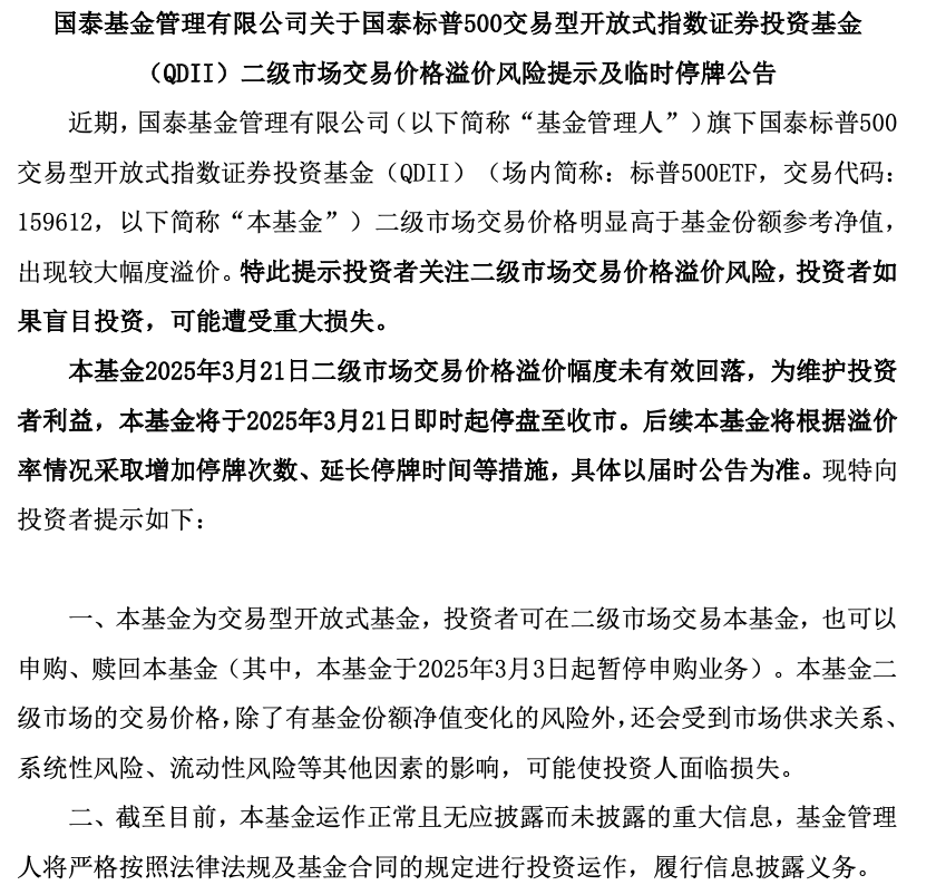 3月20日,国泰基金因溢价风险将国泰标普500ETF于3月21日开市起至当日10时30分停牌。公告中强调,“若该基金2025年3月21日当日二级市场交易价格溢价幅度未有效回落,该基金有权采取向深圳证券交易所申请盘中临时停牌、延长停牌时间等措施以向市场警示风险。”