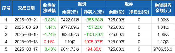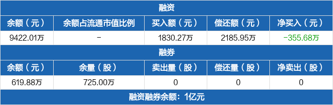融资方面,当日融资买入1830.27万元,融资偿还2185.95万元,融资净偿还355.68万元,连续3日净偿还累计1614.79万元。融券方面,融券卖出0份,融券偿还0份,融券余量725万份,融券余额619.88万元。融资融券余额合计1亿元。