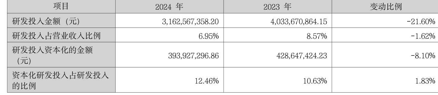 2024年全年,公司研发投入金额为31.63亿元,同比下降21.6%;研发投入占营业收入比例为6.95%,相比上年同期下降1.62个百分点。此外,公司全年研发投入资本化率为12.46%。