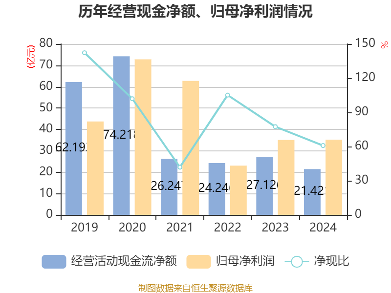 截至2024年,公司经营活动现金流净额为21.42亿元,同比下降21.03%;筹资活动现金流净额-6.79亿元,同比增加19.64亿元;投资活动现金流净额-29.22亿元,上年同期为-2.78亿元。