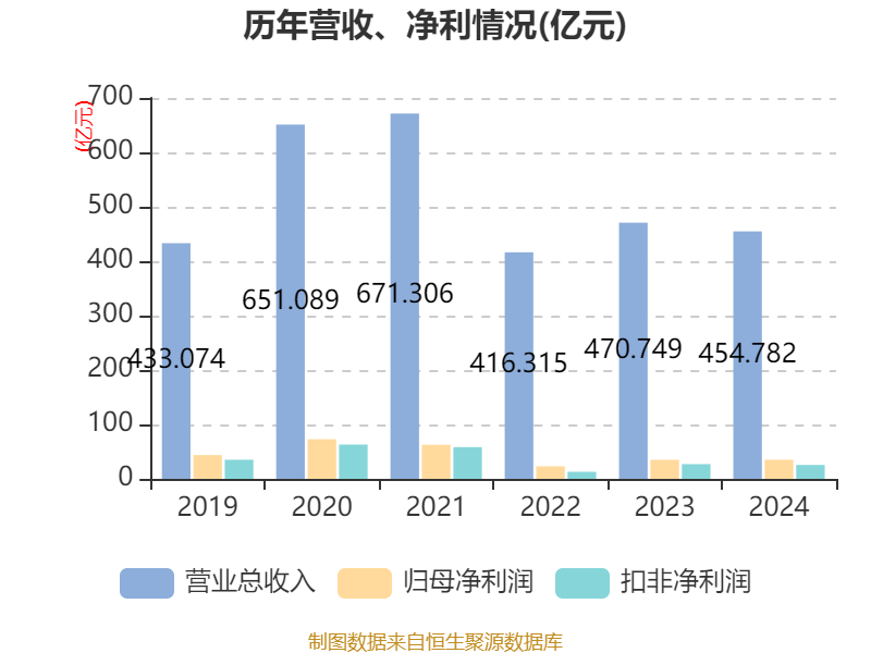 中证智能财讯中联重科(000157)3月25日披露2024年年度报告。2024年,公司实现营业总收入454.78亿元,同比下降3.39%;归母净利润35.2亿元,同比增长0.41%;扣非净利润25.54亿元,同比下降5.70%;经营活动产生的现金流量净额为21.42亿元,同比下降21.03%;报告期内,中联重科基本每股收益为0.41元,加权平均净资产收益率为6.24%。公司2024年度分配预案为:拟向全体股东每10股派现3元(含税)。