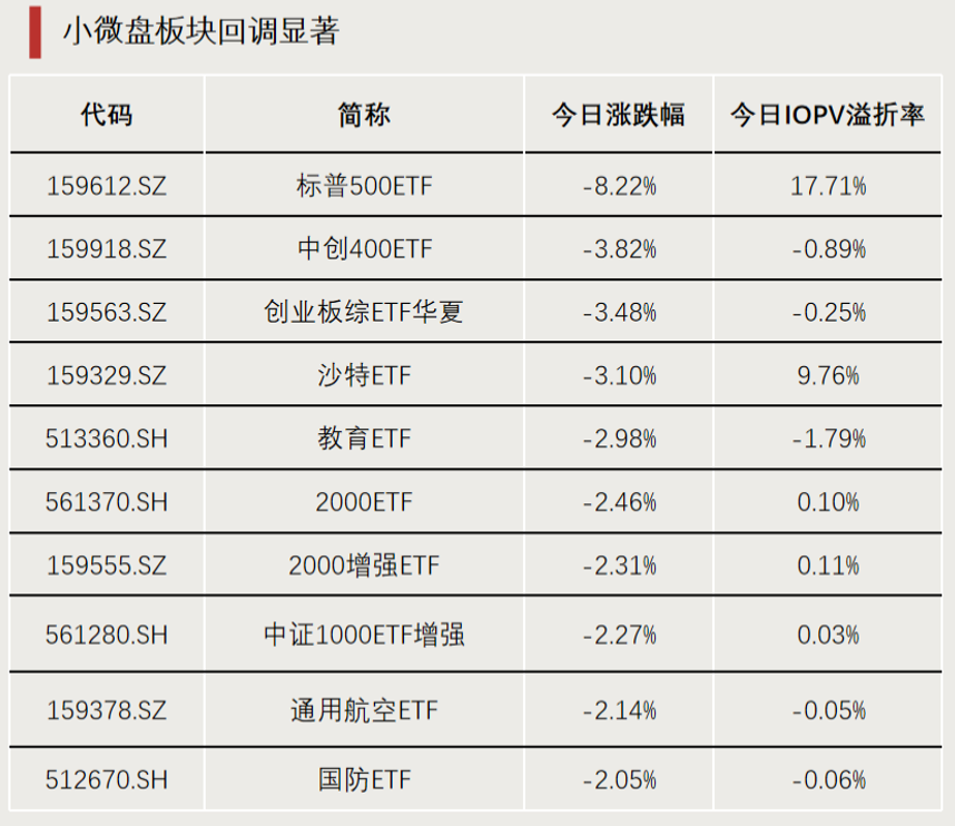 今日小微盘风格表现较弱,中创400ETF(159918)、2000ETF(561370)等跌超2%,教育、军工、通用航空等主题ETF跌幅居前。