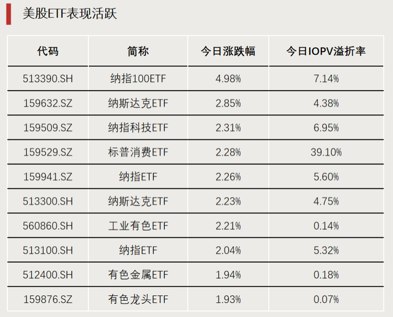 美股等主题跨境ETF近期表现活跃,纳指100ETF(513390)今日上涨近5%,位居ETF首位,成交额较前一交易日增加超30亿元;标普消费ETF(159529)溢价率逼近40%,创近一个月以来新高。