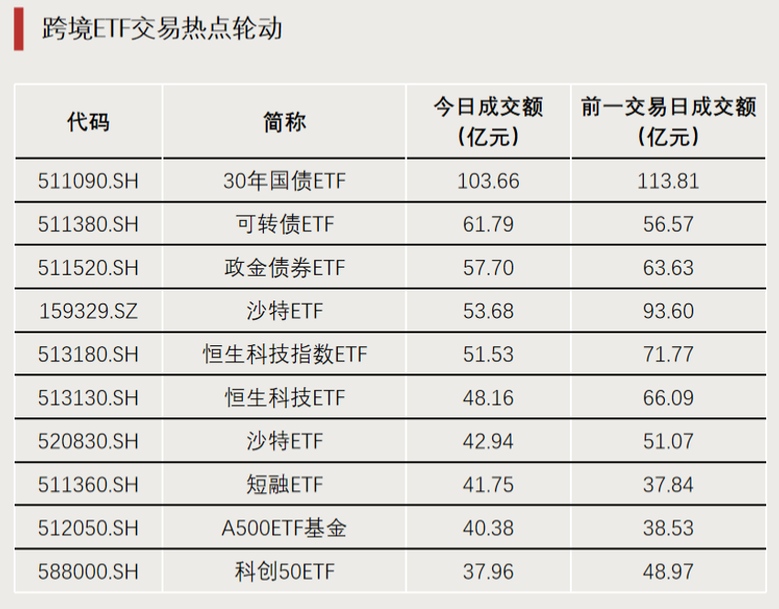 从今日交易情况来看,跨境ETF依然较为火热,沙特ETF(159329)、恒生科技指数ETF(513180)等成交额均突破50亿元,但较前一交易日出现明显缩量;而涨跌幅较为突出的纳指100ETF(513390)、标普500ETF(159612)成交量均显著提升。