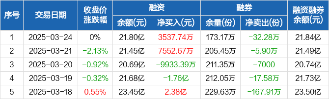 融资方面,当日融资买入4.61亿元,融资偿还4.26亿元,融资净买入3537.74万元。融券方面,融券卖出8.15万份,融券偿还40.43万份,融券余量173.17万份,融券余额365.74万元。融资融券余额合计21.84亿元。