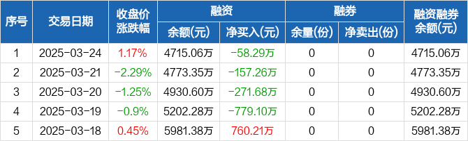 融资方面,当日融资买入601.12万元,融资偿还659.41万元,融资净偿还58.29万元,连续4日净偿还累计1266.32万元。融券方面,融券卖出0份,融券偿还0份,融券余量0份,融券余额0元。融资融券余额合计4715.06万元。